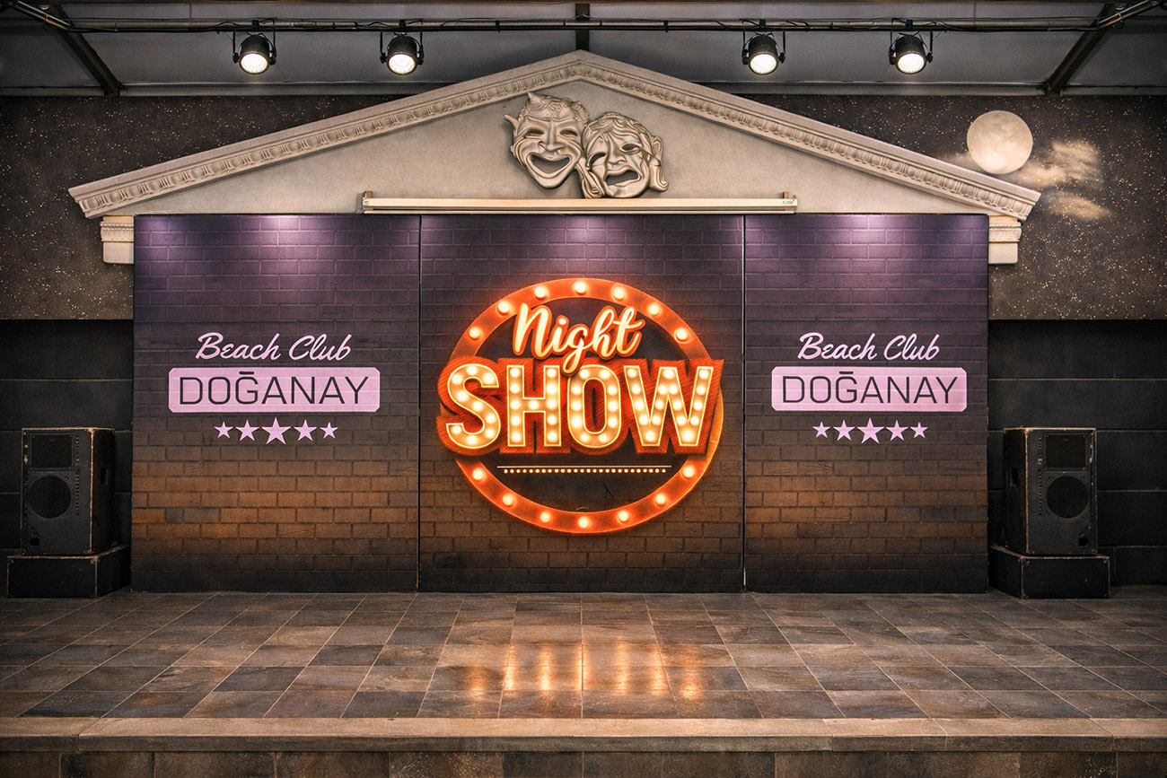 Beach Club Doğanay Hotel için özel olarak tasarlanan amfitiyatro animasyon sahnesi branda vinil germe dijital baskı uygulaması, otel eğlence alanlarına güçlü bir görsel kimlik kazandırmak amacıyla üretilmiştir. Gece şovları, animasyon gösterileri ve sahne etkinlikleri için tasarlanan bu çalışma, hem estetik hem de kurumsal algıyı üst seviyeye taşır.