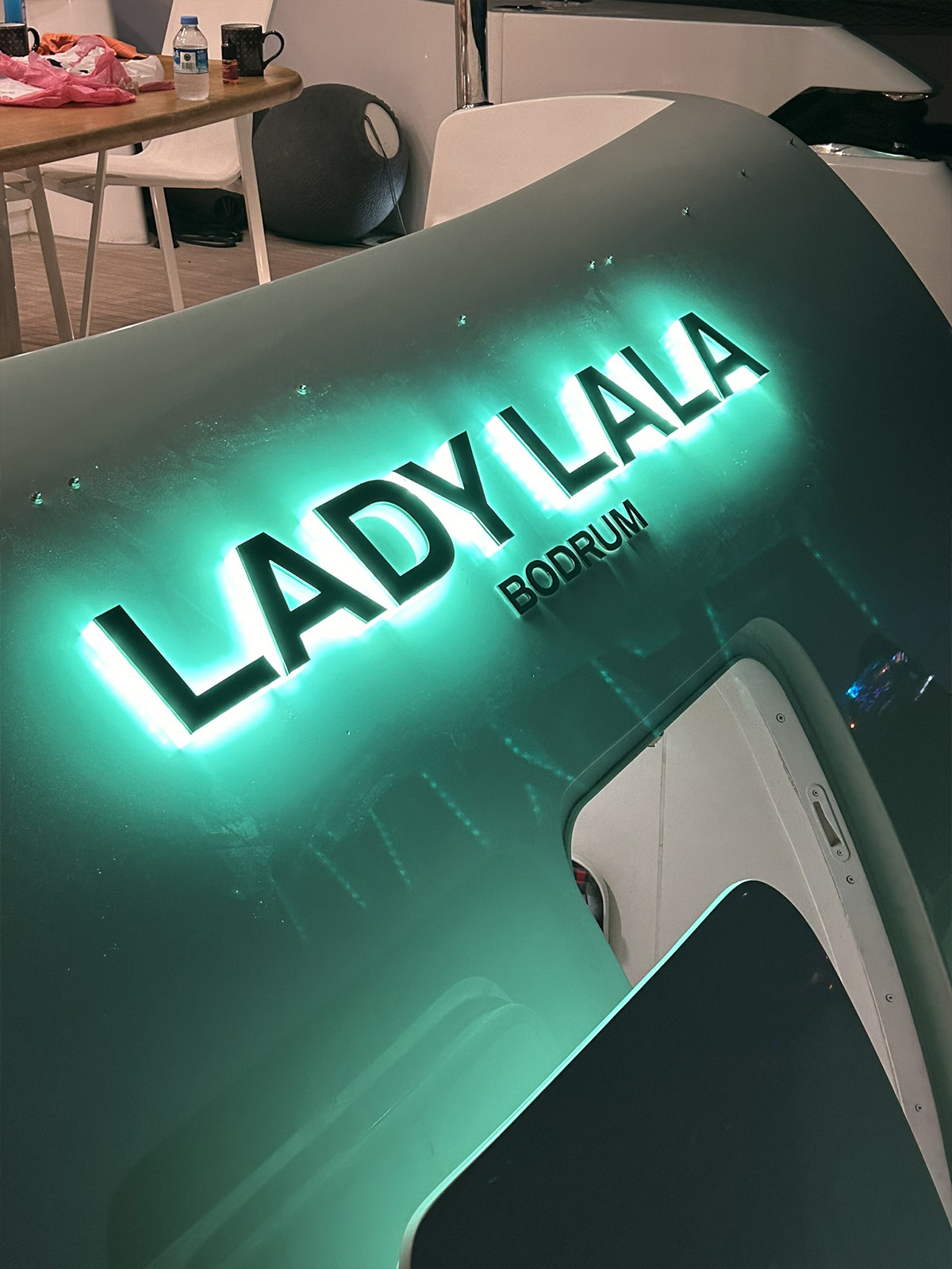Bu projede 10 mm krom rakı beyazı pleksi harfler tercih edildi. Krom yüzeyin verdiği modern ve lüks duruş, RGB LED aydınlatma sistemi ile birleşerek gece-gündüz fark edilmeyi garanti altına aldı. Özellikle marina ve gece seyirlerinde teknenin duruşunu bir üst seviyeye taşıyan bu uygulama, teknenin kimliğini güçlü bir şekilde vurguluyor. ✨🌙