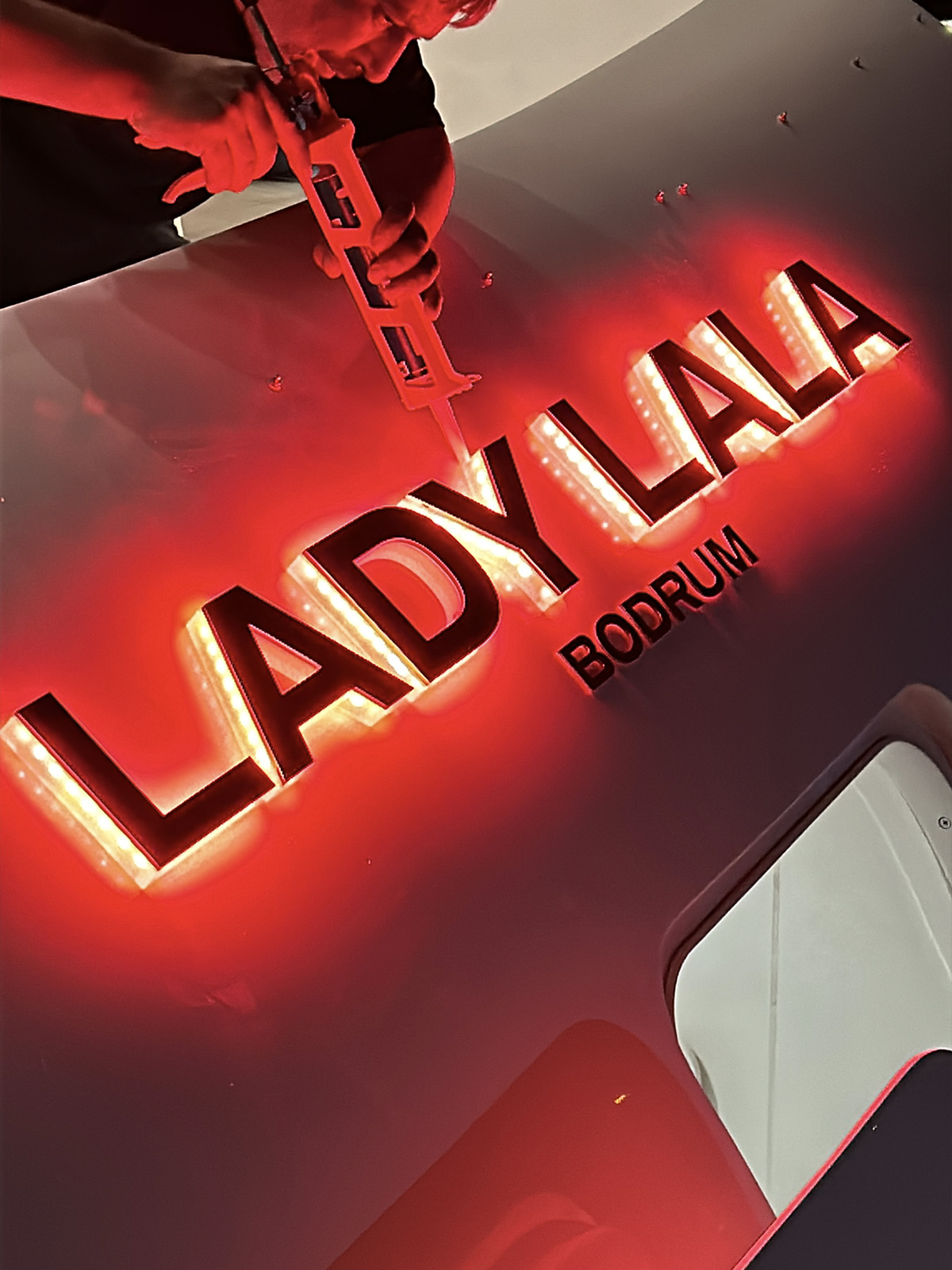 🚤✨ Lady Lala Alanya – Tekne Krom Yazı Uygulaması | Krom, Pleksi & RGB LED