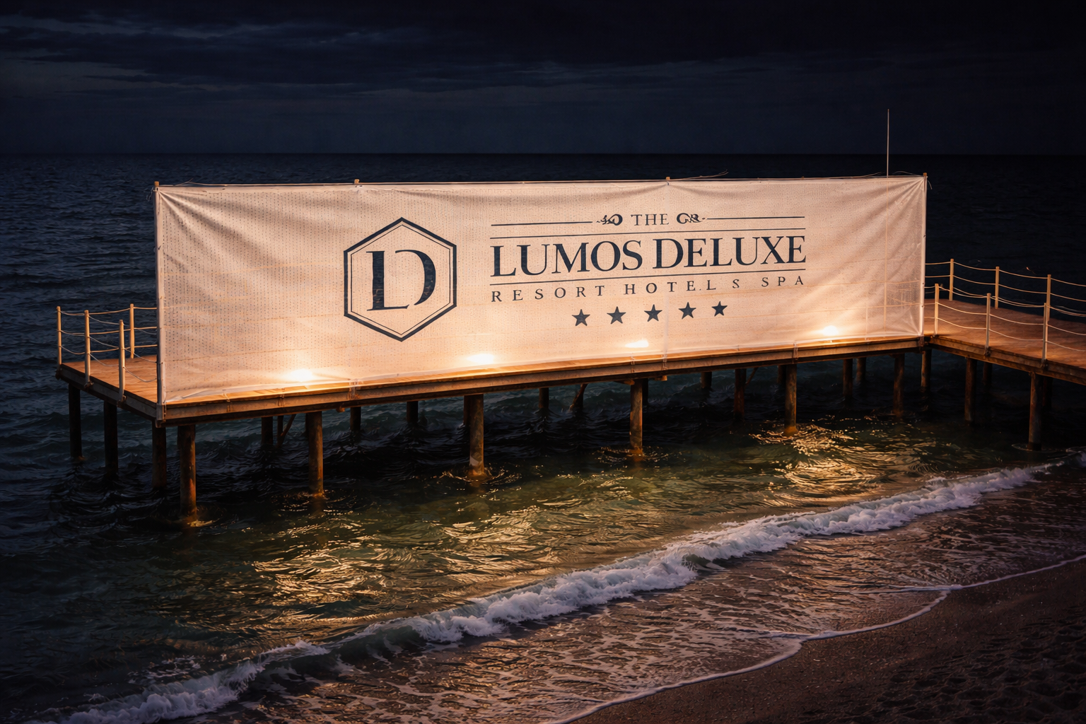 Bu çalışmada hedeflenen; Lumos Deluxe Hotel’in marka algısını güçlendirmek, sahil hattında dikkat çekici ama zarif bir tanıtım sağlamaktır. Kullanılan mesh branda, otelin lüks ve kurumsal duruşunu desteklerken çevreyle uyumlu bir görünüm sunmaktadır.