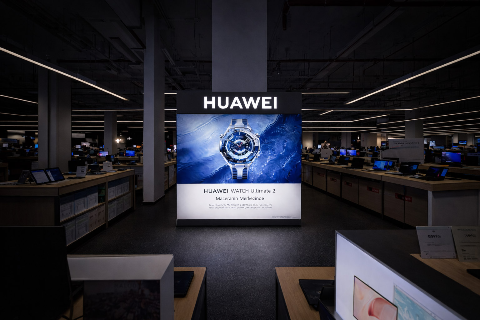 Huawei gibi global markalar için modern, minimal ve güçlü ışık veren lightbox tasarımlar tercih edilir.