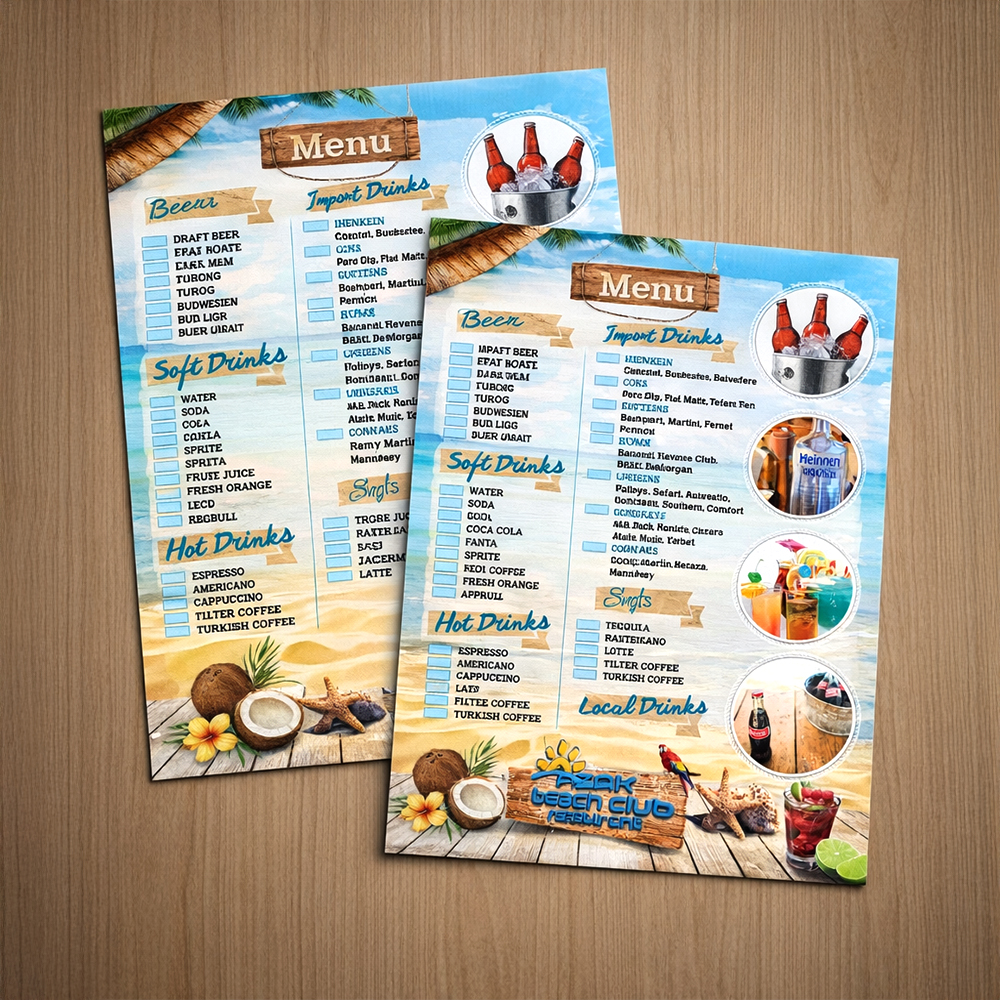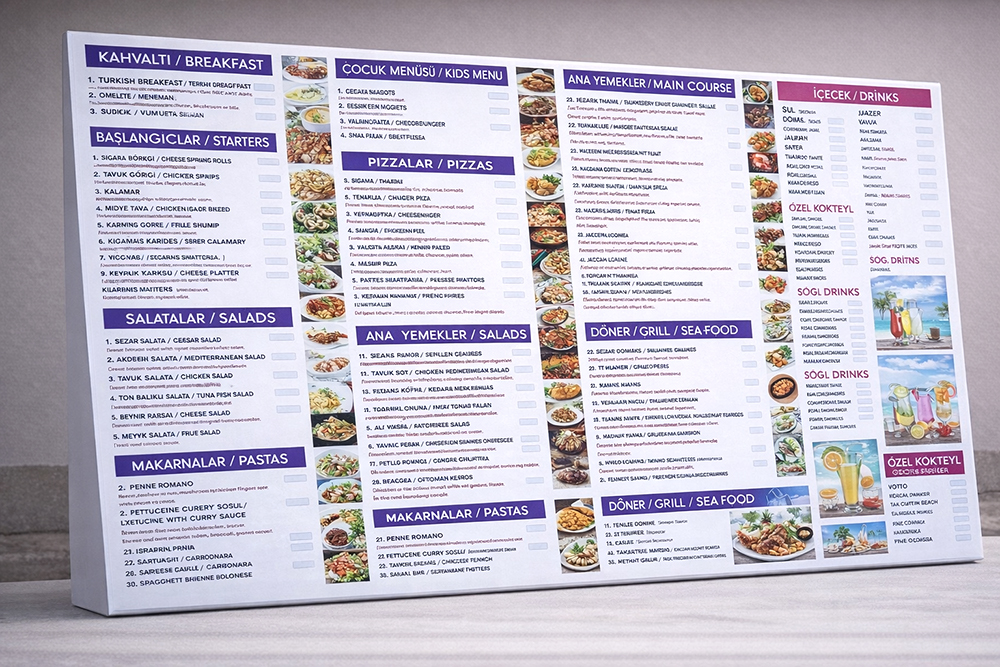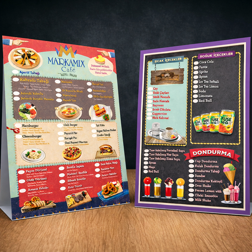 Restaurant menüsü restoran ve kafelerin en sık ihtiyaç duydukları görsel ürünlerdir. Müşterilere Restaurant menüsü sunumu için gerekli olan görsel ürünler masalarda adeta bir şölen yaratır. Profesyonel grafikerlerimiz eşliğinde hazırlanan restaurant menüleri, gerçeklik hissiyatı vererek müşterilerinizi sipariş öncesinde tatmin eder.