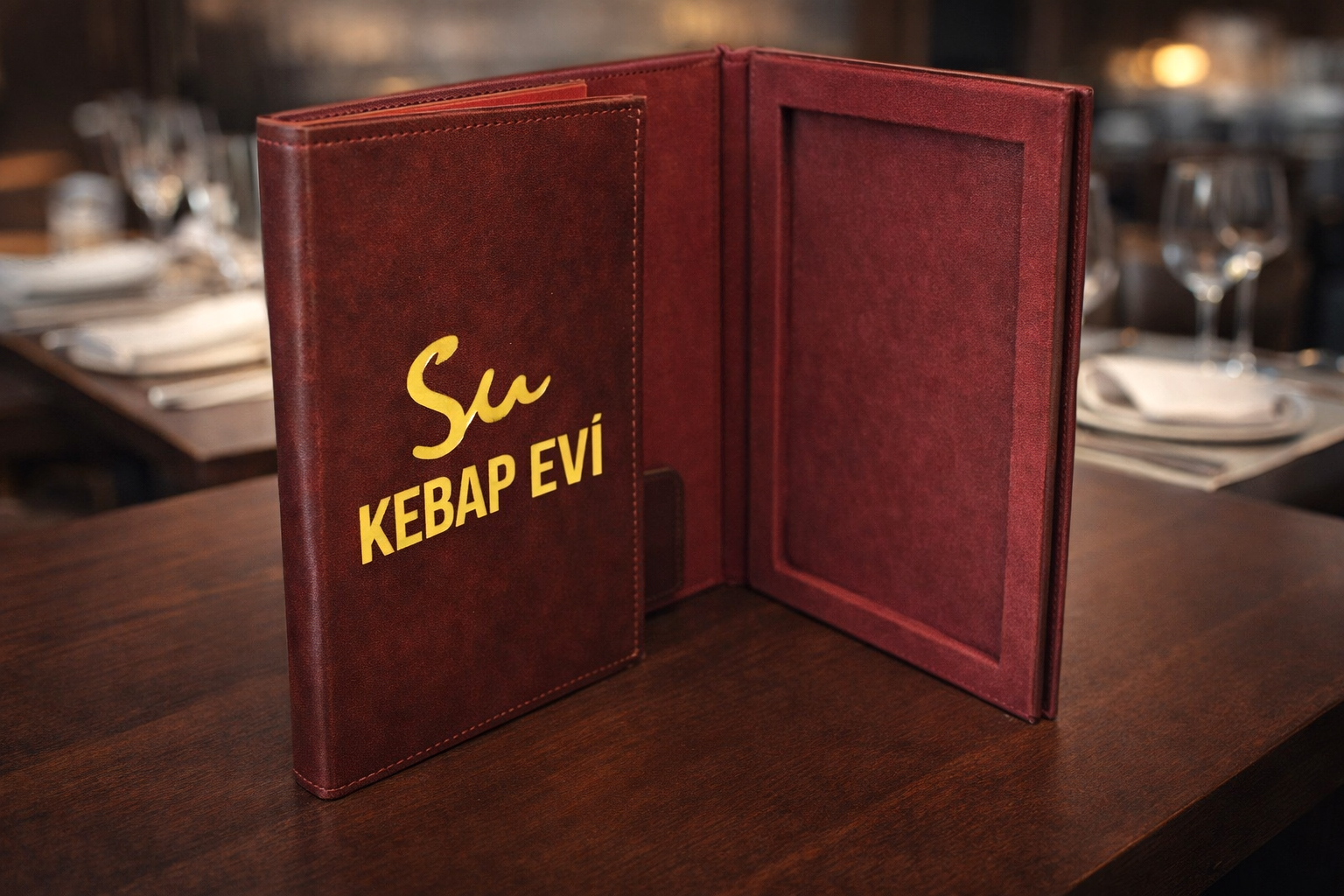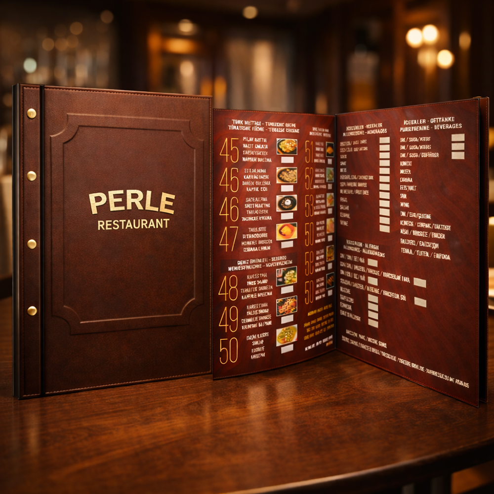 - Bu sayede uzun ömürlü olarak kullanılabilir. Tercih edilen restoran dış menüsü ile yapraklar bir araya getirilir ve menü halini alır.